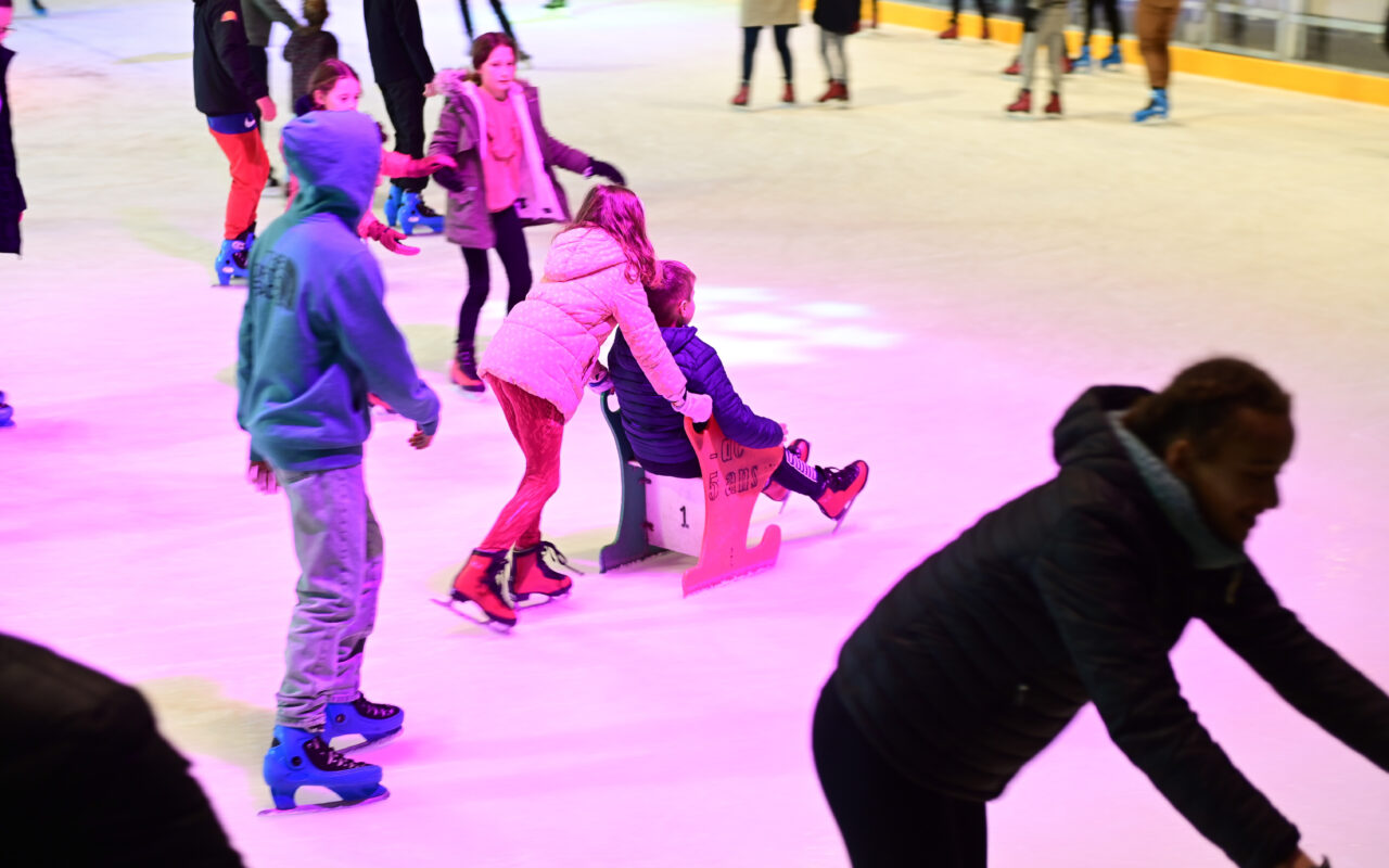 Les plus grands peuvent s’aider de la balustrade disponible sur tout le bord de piste. - Vous et/ou les enfants ne savent pas très bien patiner ? « Laissez vos deux pieds sur la glace, penchez-vous légèrement en avant, genoux fléchis et faites de tous petits pas sur la glace. Vous glisserez quand vous serez prêts. »
